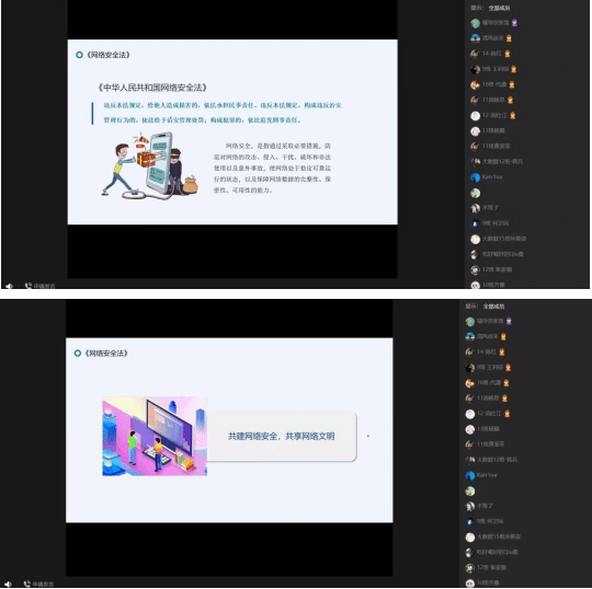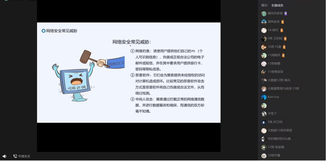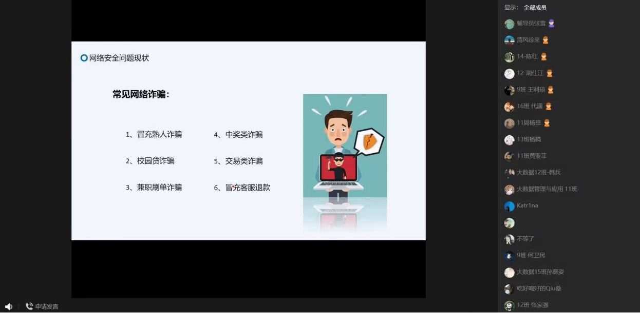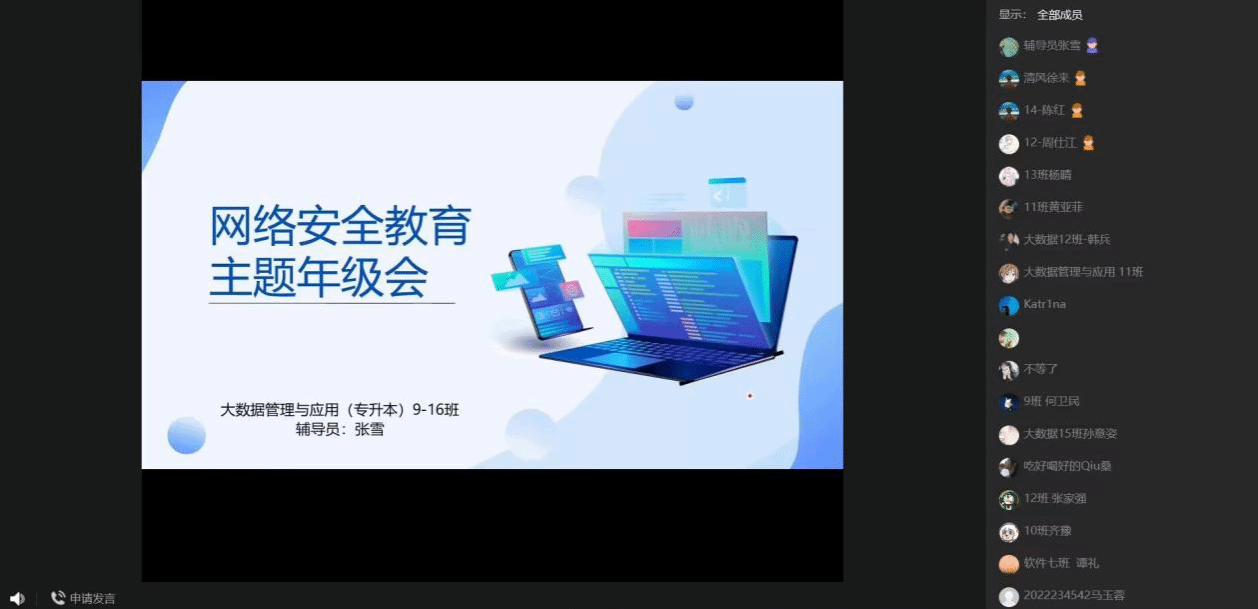 随着现代科技的发展,电脑﹑手机已成为人们生活的必备物品,人们在享受信息时代方便快捷﹑体验美妙奇幻世界的同时,越来越多的网络安全正悄然侵蚀着人们日常的生活。近期,为了增强我们网络安全意识,数字经济与信息管理学院大数据管理应用专升本9-16班全体同学于2023年11月22日19:30,在QQ群课堂开展了“网络安全教育”主题年级会宣传活动,由2022级专升本辅导员张雪老师主讲。