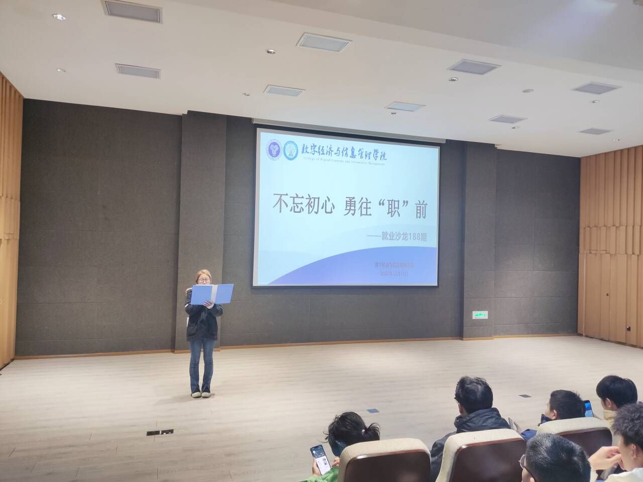 为给学生提供一个了解就业市场、提升就业技能、拓展人脉资源的平台。由就业创业指导与服务中心主办,数字经济与信息管理学院承办的就业沙龙188期于2023年12月15日15:00在六度空间∞(无限)多功能厅圆满举办。在这次活动中特别邀请到数字经济与信息管理学院就业创业办公室主任张婷老师作为主讲嘉宾,以亲身经历和自己的独到见解,为学生们带来宝贵的就业技能知识指导。