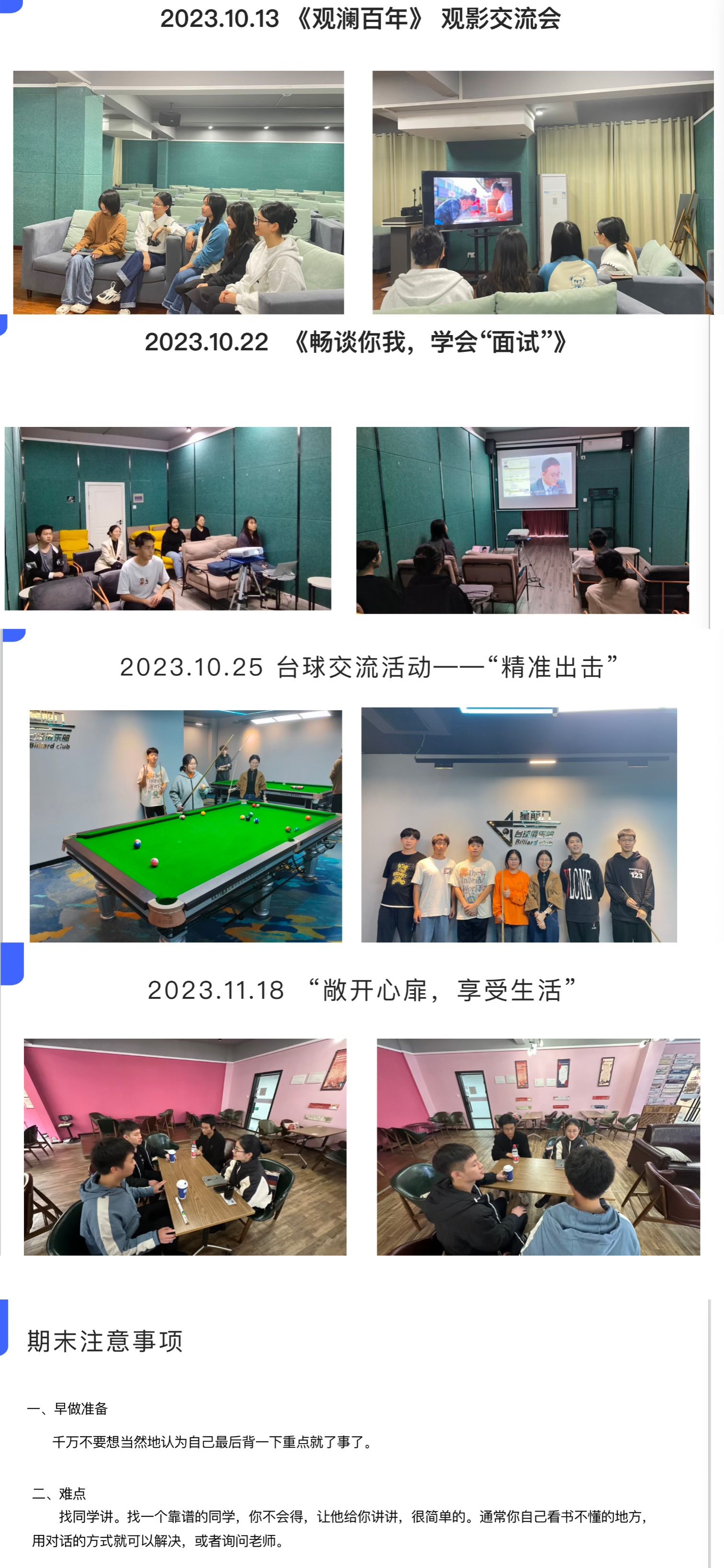 本学期我们在“玩中学,学中玩”度过难以忘怀的美好时光,通过观影《观澜百年》一起了解中国的历史文化,共同探讨分享中国的历史景点以及历史典故。在竞争激烈的就业环境中,我们提前参与了“模拟面试”,尽早的了解到面试中的着装以及仪态等各方面。通过参与各种异科活动,比如台球“小球彰显大智慧”,人生正如台球一样会面临意想不到的困境,但我们不能放弃。通过一次次的谈心谈话,做好学生故事的聆听者,并从中基本了解了学生的性格特征、兴趣爱好以及学习生活方面的不足等方面信息。后续通过学生的发展需要、活动意向、自身能力、存在问题等情况进行分类整理后开展了有针对性的活动和个性化指导。