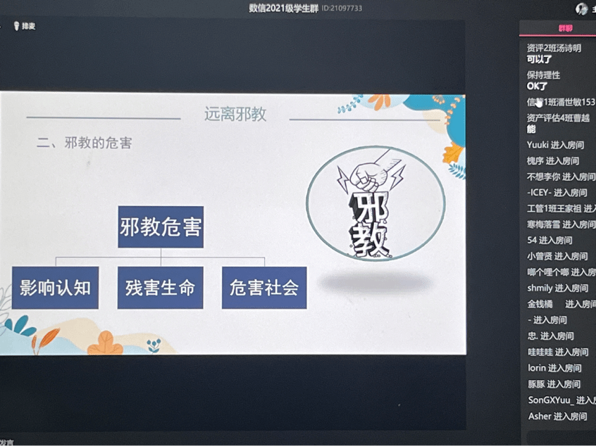 为切实保障同学们的财产安全、饮食安全、生命安全,辅导员老师们通过“了解安全教育 增强安全意识”“维护国家安全 筑牢安全防线”“掌握消防知识 增强防火意识”“擦亮识骗慧眼 铸就防骗长城”“谨防校园盗窃 重视实验安全”“关注身心健康 共享生命阳光”“提高自防能力 保障人身安全”“科学防灾减灾 共建和谐家园”这八个主题方面进行讲解。各位辅导员老师强调每位同学要保护好自己的生命、财产、信息、心理安全,加强安全常识的学习,提高防诈骗、防火防灾意识,培养自己独立思考和信息甄别的能力。辅导员老师们指出作为新时代大学生,不仅需要了解国家法律法规,更应该尊重法律,规范自己的一言一行,培养自己良好的行为习惯、学习习惯和生活习惯。