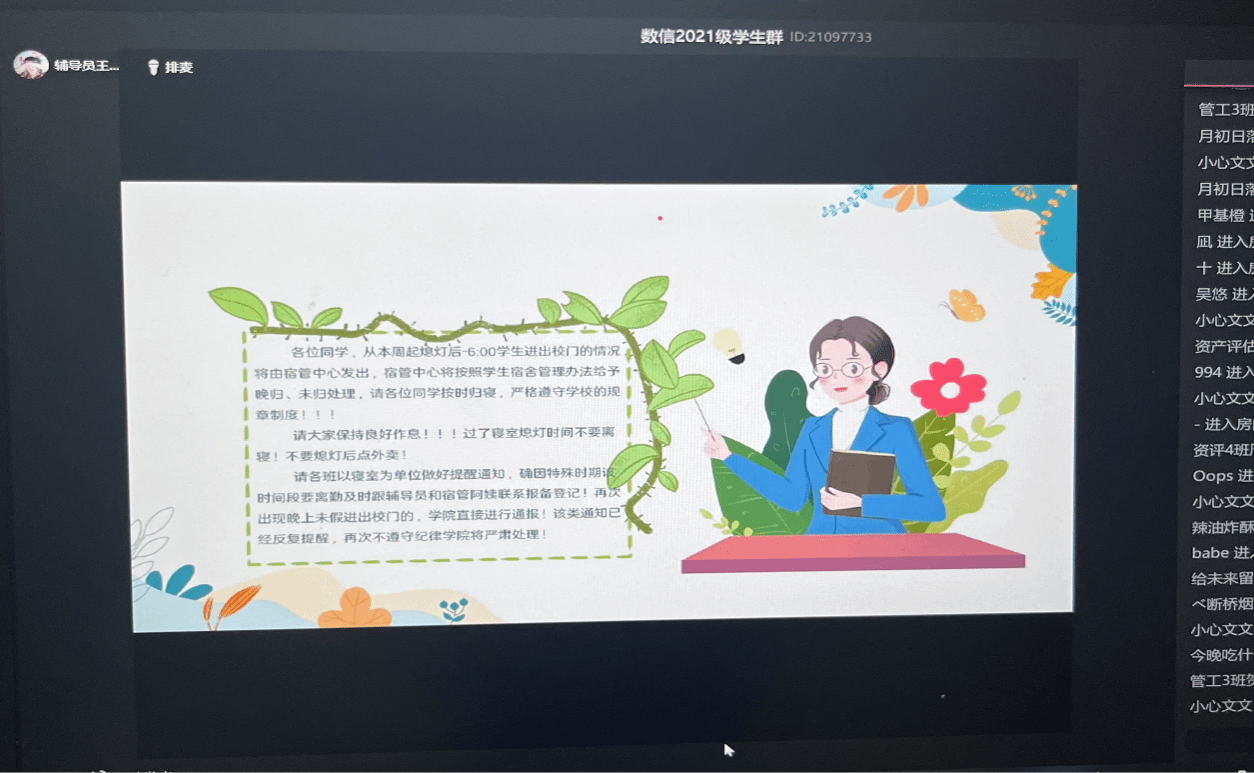 新学年,新目标,新征程。为增强学生安全意识,提高学生自我防范能力,加强校风校纪思想建设,营造良好的校园氛围,让同学们以崭新的精神面貌投入到新学期学习生活中。数字经济与信息管理学院(合川校区)大三五位辅导员以线上、线下的形式相继开展入学教育,主要围绕安全教育、心理健康教育以及入学思想引领这三方面进行。