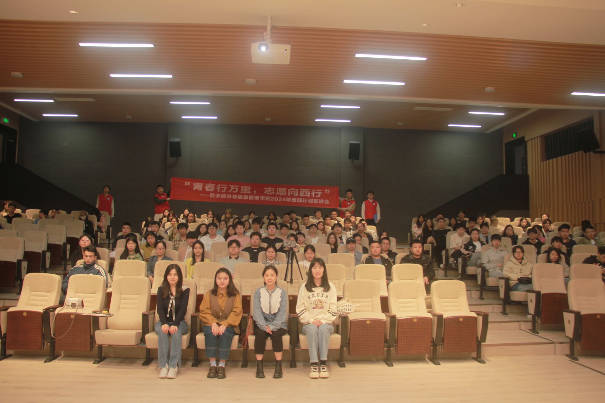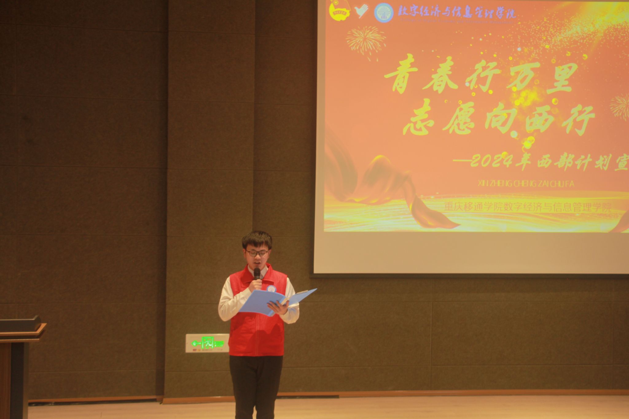 “青春选择,雄心万里,好儿女纵横天下披风沐雨……到西部去,到基层去,到祖国最需要的地方去。”一首《西部计划》生动诠释着风华正茂的青春里总要勇敢一次,是结束,也是开始。一路向西,以志愿之名,赴西部之约。为了更好地助力西部地区的发展,重庆移通学院数字经济与信息管理学院积极响应国家西部计划的政策号召,特此于4月8日在6度空间无限多功能厅以线上+线下的方式开展了一场精彩的西部计划宣讲会,本次活动旨在让更多的同学了解西部计划,激发青年学子的社会责任感,传承担当精神,为西部地区的发展贡献力量。此次活动累计参与人数达900余人,其中线上观看人数多达600人,线下参与人数300余人。