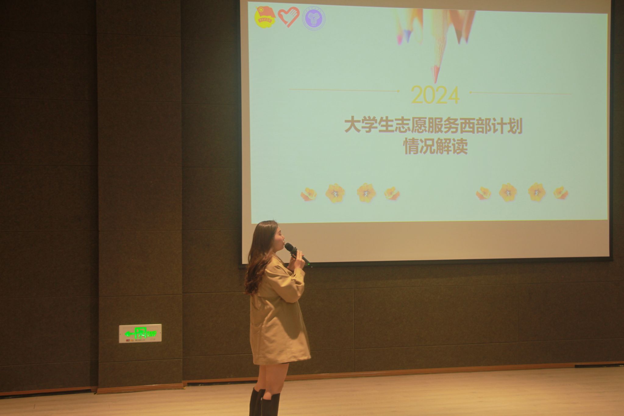 本次宣讲会由观看宣讲视频、校团委徐一丹老师讲解、往届西部志愿者分享、现场答疑解惑、志愿服务板块指导老师邓颖蕾总结发言、合影留念六个部分组成,宣讲会以主持人对西部计划的概念和西部计划宣传视频开启篇章。视频中,不同年代的青年们,虽来自不同的地方,但心都向着美丽的大西部,志愿扎根西部,在不同的领域做着不同的工作,以他们的实践实例,书写着无悔的青春。