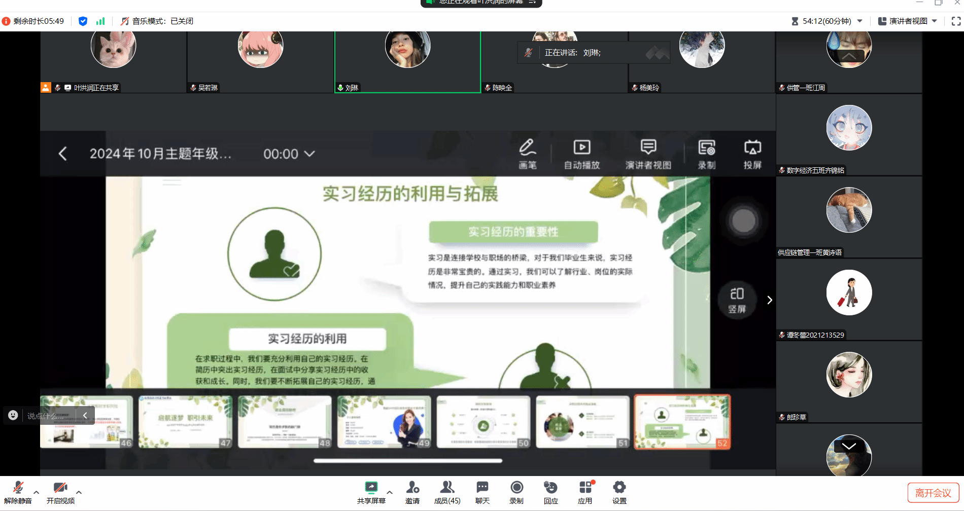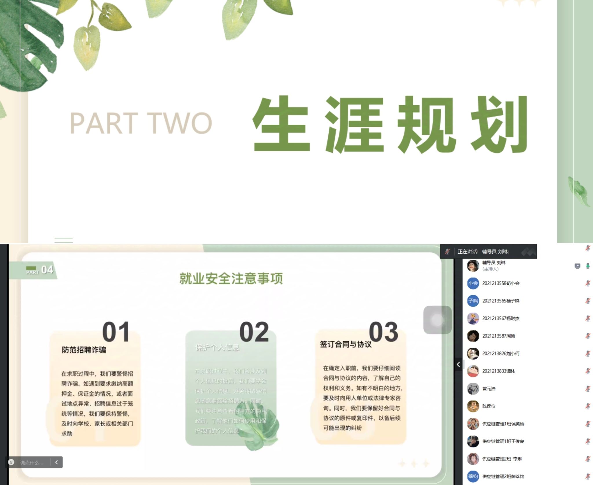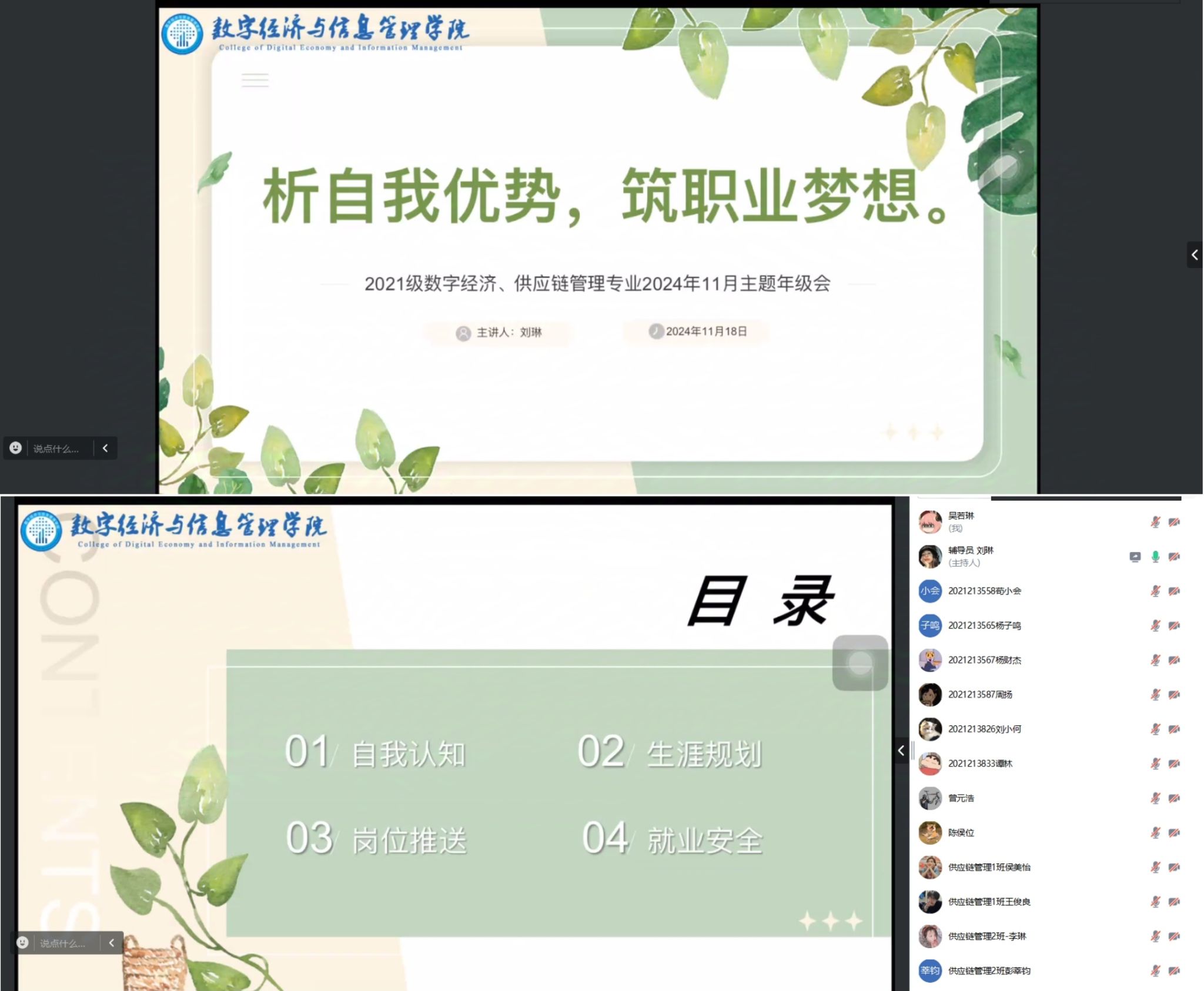 为帮助即将步入职场的同学们更好的了解就业形势,为他们点亮职业规划的明灯,明确个人职业方向,并传授实用的求职策略与求职技巧,数字经济与信息管理学院于2024年11月18日晚19:00在腾讯会议成功开展了2024-2025学年2021级数字经济、供应链管理专业“析自我优势,助职业梦想”十一月主题年级会。此次会议由辅导员刘琳老师主讲,通过最新实习岗位信息分享、离校就业安排以及就业安全指导等内容,为同学们的职业生涯发展之路铺设了坚实的基石,确保他们在未来的求职旅途中能够顺利前行。