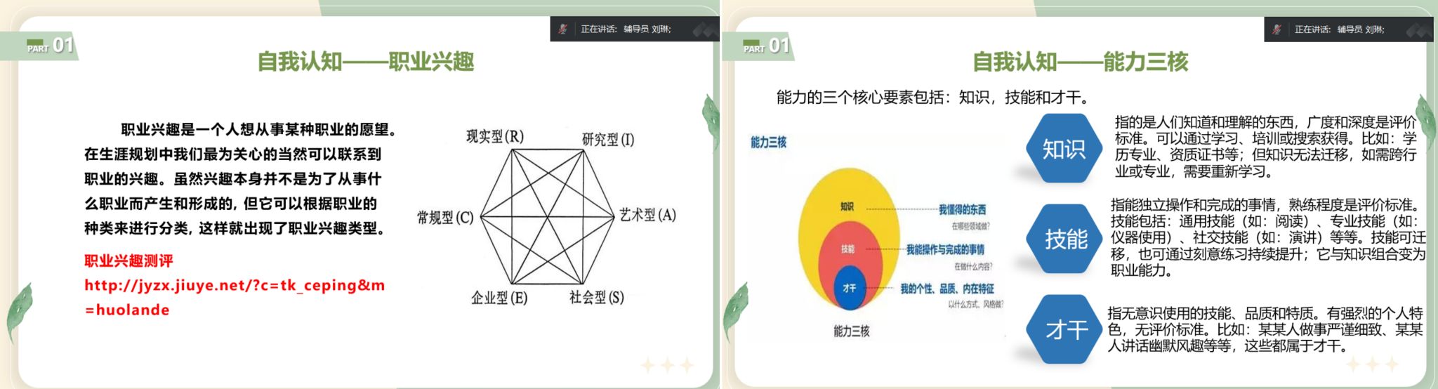 会议伊始,刘琳老师强调了自我认知的重要性。她指出,每位学生都应深入了解自己的兴趣、优势、价值观以及技能,这是职业生涯规划的基础。通过分享多个自我认知的方法和工具,如MBTI性格测试、职业兴趣测评等,刘琳老师鼓励同学们在日常生活中不断反思和探索,从而更好地认识自己。她还分享了最前沿的27项能力素质模型和能力素质词典,给大家演示了如何通过自我认知找到适合自己的职业方向,为在场学生提供了宝贵的经验和启示。
