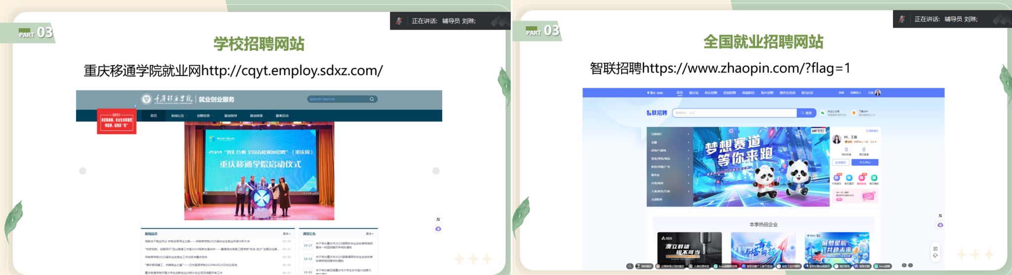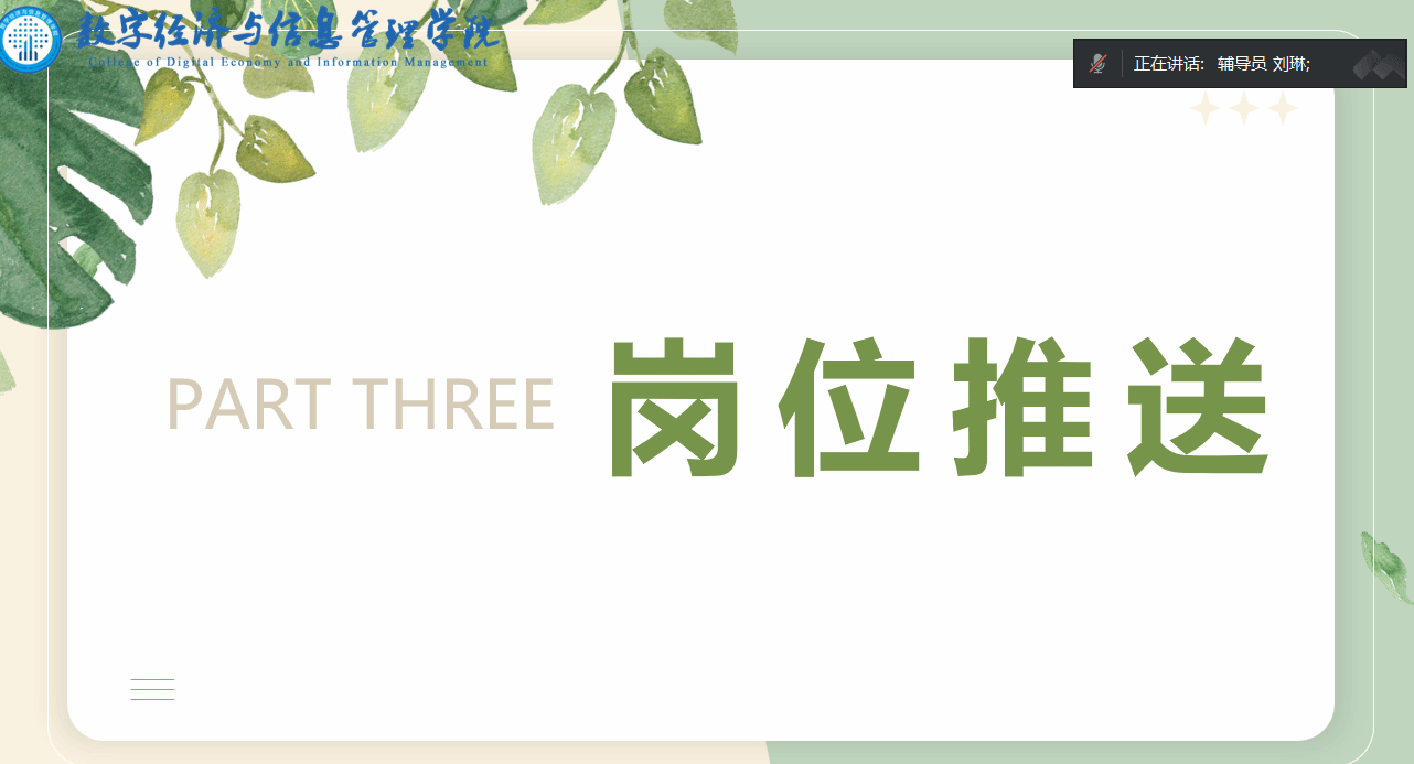 在岗位推送环节,刘琳老师详细介绍了当前数字经济和供应链管理领域的热门岗位及就业前景。她分享了学校就业指导中心近期收集的招聘信息,包括知名企业、创业公司、政府机关等提供的多种职位,并强调了这些岗位对学生专业技能和综合素质的要求。此外,刘琳老师还介绍了如何利用学校就业信息网、社交媒体、招聘APP等平台获取更多岗位信息,鼓励同学们积极投递简历,争取面试机会,并在不断的面试中锻炼自己。