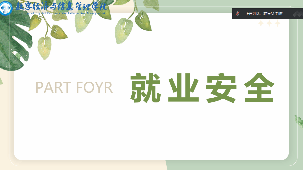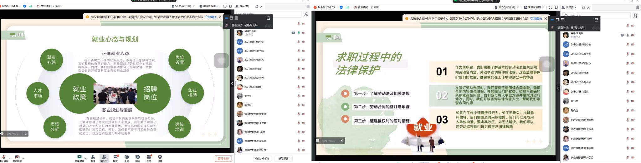 会议的最后,针对就业安全问题,刘琳老师特别强调了防范求职陷阱的重要性。她列举了常见的求职陷阱,如虚假招聘、非法中介、高薪诱惑等,并详细讲解了如何识别这些陷阱,避免上当受骗。刘琳老师还提醒同学们在求职过程中要注意保护个人隐私,避免泄露敏感信息。她建议同学们在签订劳动合同时,要仔细阅读合同条款,保持良好的就业心态,及时做好就业规划,确保自己的合法权益不受侵害。
