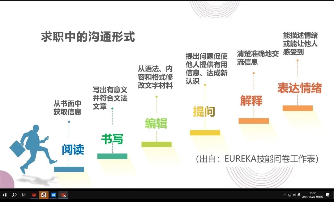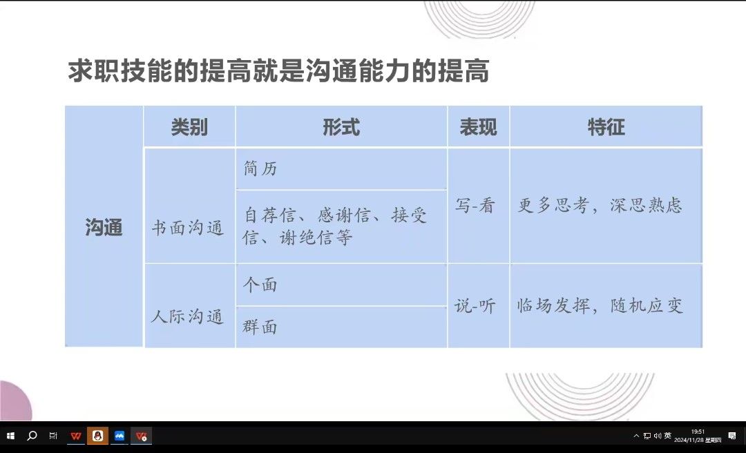 随后,马莉老师向同学们强调求职技能的提高还需要沟通能力的提高。求职中的沟通分为书面沟通——制作简历和人际沟通——面试技巧。