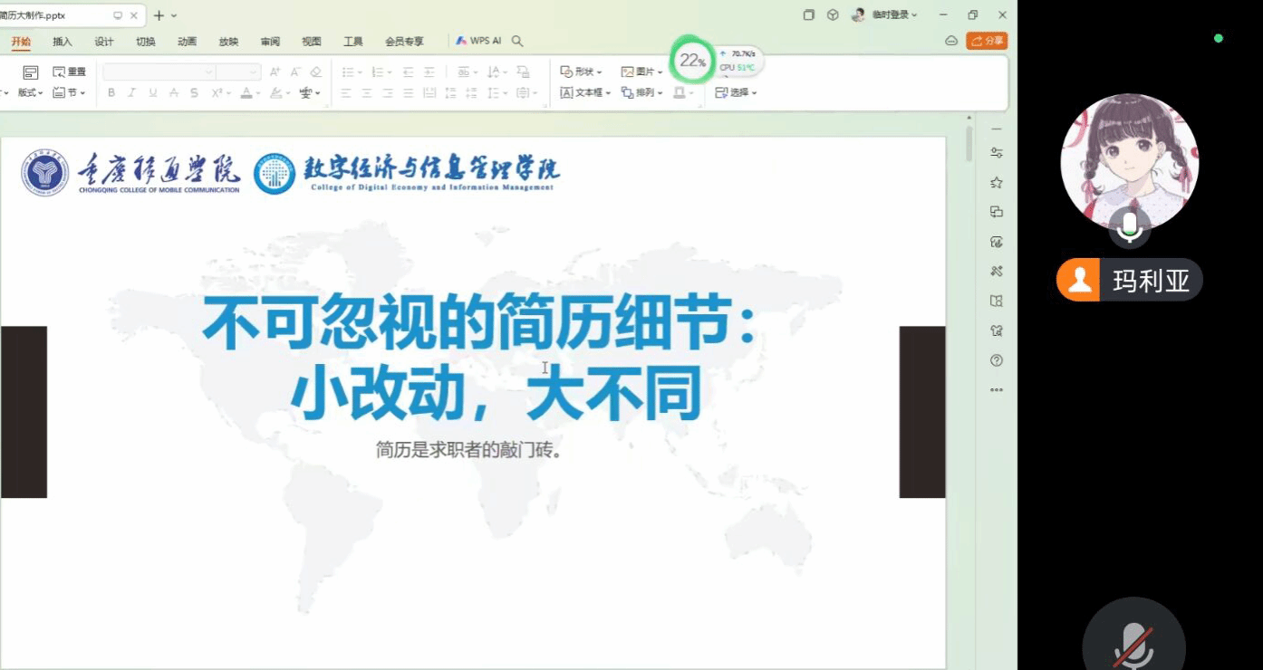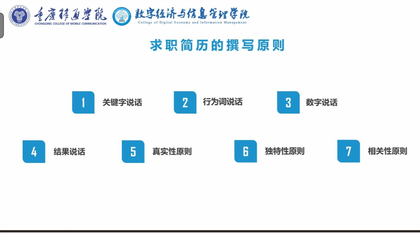 在求职的海洋中,简历犹如一艘精致的帆船,承载着求职者的梦想与期待,驶向理想的彼岸。为帮助同学们更好地制作简历,提升求职竞争力,数字经济与信息管理学院辅导员马莉老师于2024年5月27日晚8点,使用腾讯会议通过线上会议的方式为数字经济1-3班和工程管理5-7班的177名同学成功举办“不可忽视的简历细节:小改动,大不同”——简历是求职者的敲门砖就业主题年级会。