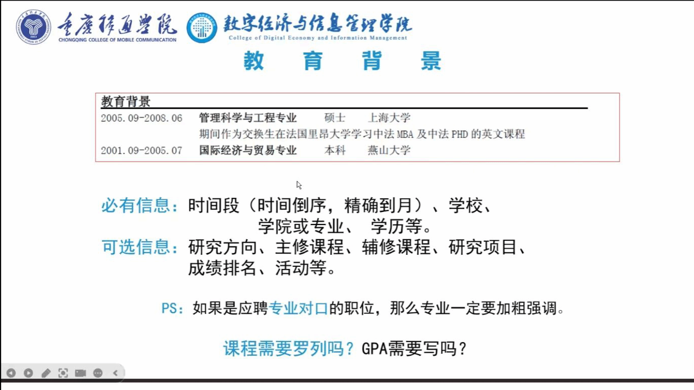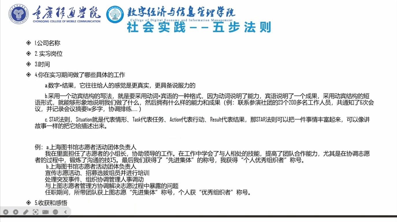 马莉老师继续深入讲解“求职意向的写法、教育背景的可用信息和可选信息以及社会实践——五步法则等”,她还分享如何巧妙地运用这些技巧,使简历更具吸引力和竞争力。马莉老师强调,写求职意向时,要清晰明了地表达自己的职业目标,让招聘者一眼就能看出你的发展方向和动力。而在描述教育背景时,除基本的学历和专业信息,还可以适当加入一些与职位相关的课程或项目经历,以展示自己的专业素养和实践能力。