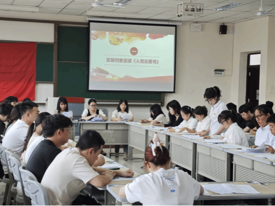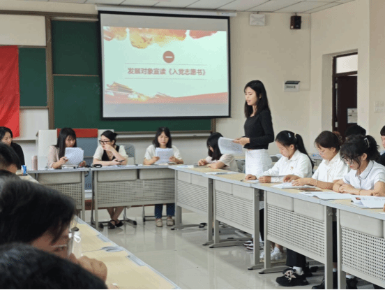 会议开始,任书记宣布党员参会情况,并讲解接收中共预备党员大会流程。大会开始由发展对象易思齐等人逐一宣读《入党志愿书》;随后由入党介绍人介绍发展对象的培养情况,并对其能否入党表明意见;由任瑞娟书记代表支委会报告对易思齐等发展对象的审查意见,经支委会研究、学校党委预审,符合程序,材料齐全,可以接收为中共预备党员。