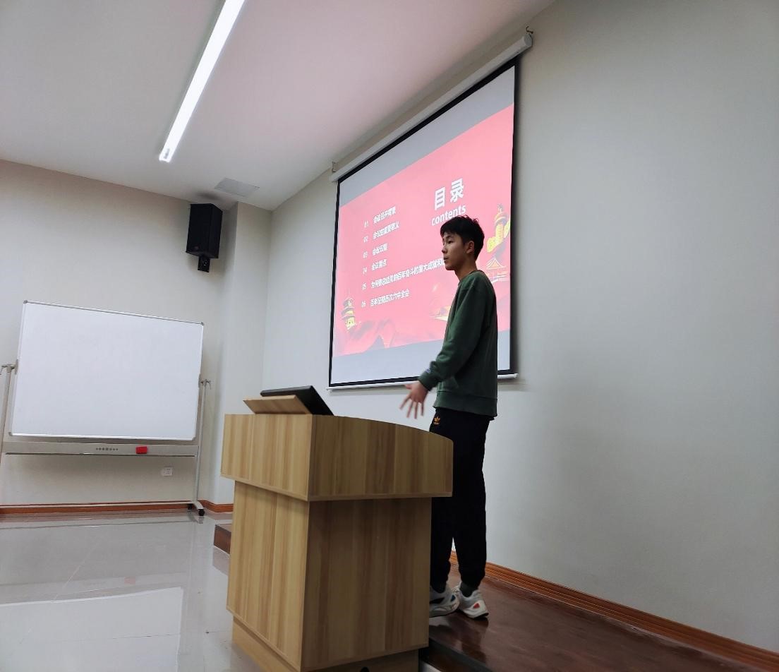 历史的清风,划过时空的隧道,我们的祖国在百年征程中留下光辉的篇章,在十九届六中全会中始终闪烁着一面鲜明的旗帜。本次团日活动由团支书张静同学带领同学们讲解十九届六中全会精神。一是十九届六中全会的历史意义,即一百年,中国共产党始终践行初心使命,团结带领全国各族人民绘就了人类发展史上的壮美画卷,中华民族伟大复兴展现出前所未有的光明前景。二是十九届六中全会基本内容,即增强“四个意识”坚定“四个自信”、做到“两个维护”、团结带领全国各族人民夺取新时代中国特色社会主义新的伟大胜利,具有重大现实意义和深远历史意义。三是为何要总结党的百年奋斗的重大成就和历史意义。即党的经验是我们党在历尽艰辛、饱经风雨的长期摸索中积累下来的,饱含着成败和得失。凝结着鲜血和汗水,充满着智慧和勇毅。