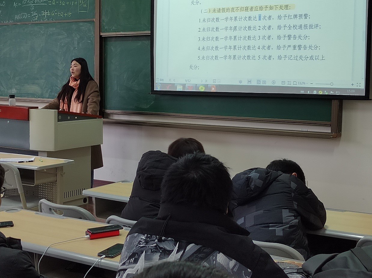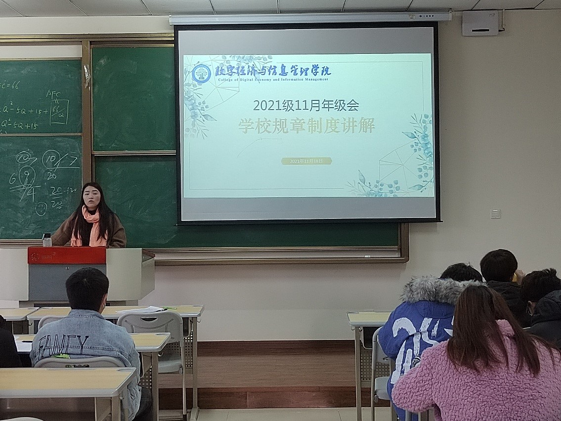 为提高2021级学生对与学校规章制度的认识,增强学生的自律意识、拼搏意识,数字经济与信息管理学院于11月18日14:30与16:10,在双栀301教室开展了以学校规章制度讲解为主题的年级会。由学院志愿服务板块指导教师、2021级辅导员王瑞老师主讲,对2021级管理科学与工程类、资产评估专业全体学生进行讲解,旨在帮助同学们解决大学学习生活中遇到的困惑,让大家更了解学校的各类规章制度。