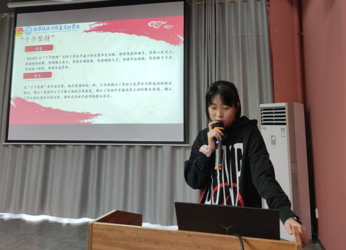 魏心楠同学分别从党的历史上第三个《历史决议》、两个确立、习近平新时代中国特色社会主义核心思想内容、以十个坚持总结党百年奋斗的历史经验,四个部分展开。