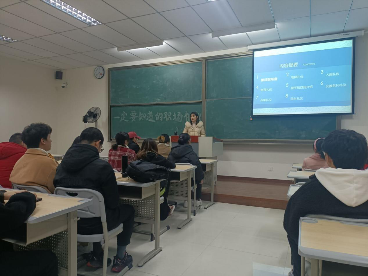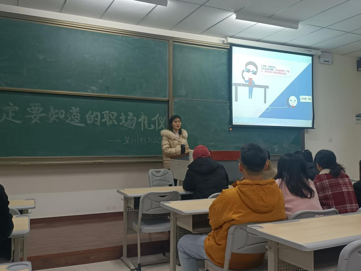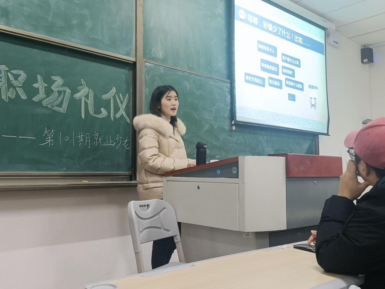 良好的仪态能够充分展现出个人气质与风度,而拥有不凡的职场礼仪也会在职场生活中绽放出绚烂的花朵。为让同学们能够走进日常职场,增强职场应变能力,培养职场礼仪,让良好的职场习惯内化于心、外化于行。我院于12月8日16:00在双栀书院307举办“一定要知道的职场礼仪”第101期就业沙龙。本次沙龙有幸邀请到学校创新创业导师、国际创业教练(中级)廖进老师为同学们分享职场礼仪。