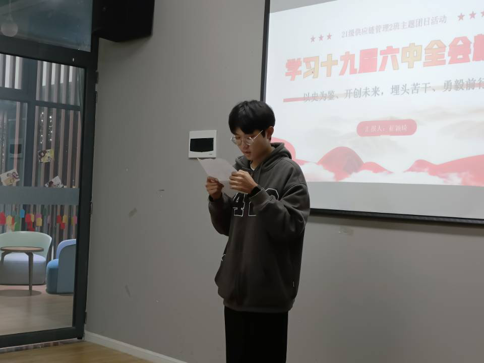 长风破浪会有时,直挂云帆济沧海。团支书崔颖琦讲到,我们应该积极贯彻落实习近平新时代中国特色社会主义思想,了解党的百年奋斗重大成就和历史经验的重要意义,带领全国各族人民以史为鉴、开创未来、埋头苦干、勇毅前行,在新时代坚持和发展中国特色社会主义,发挥青年力量,实现中华民族伟大复兴。激发同学们爱党爱国之情,坚持落实听党话、感党恩、跟党走,共同为实践中华民族伟大复兴的中国梦而不懈奋斗。我们也相信,在中国共产党的领导下,我们团结奋斗,不断进行理论创新,我们祖国会走向更辉煌的明天。