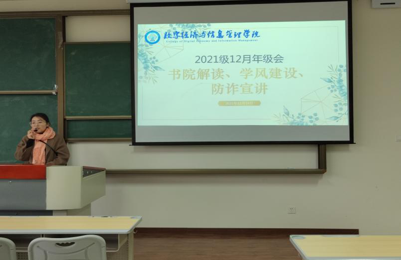 临近期末,为提高大一学生对双院制的认识,宣传诚信考试的重要性,引导同学们正确对待考试,构建良好的学风,以及提高学生对电信网络诈骗的认识。数字经济与信息管理学院于2021年12月14日在双栀书院301教室,开展“书院解读、学风建设、反诈宣讲”12月年级会,由学院志愿服务板块指导老师、2021级辅导员王瑞老师主讲,为同学们从书院、学风、反诈三个方面进行生动解读。