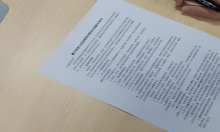 此外,就最近频发的网络诈骗案件,提醒同学们谨防电信网络诈骗,不进行刷单活动,“君子爱财,取之有道”,在期末来临之时,专心复习,并为国家反诈“打广告”,关注国家反诈中心公众号,观看反诈宣传视频,提升学生反诈骗意识,学生然后签署《数字经济与信息管理学院安全风险告知书》。