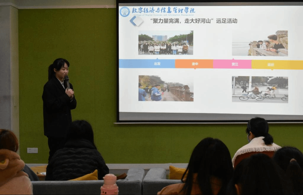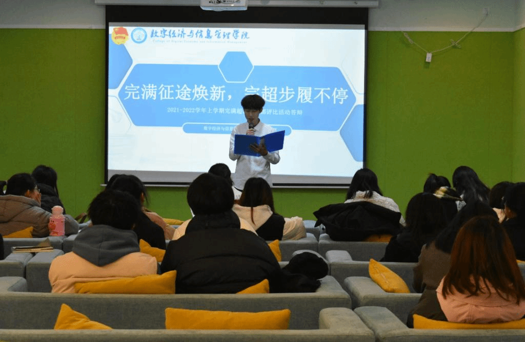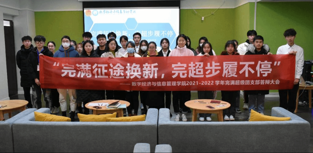 人才有高下,知物由学。为凝聚支部力量,彰显青春活力,我院分别于12月23、24日12:10在双栀书院多功能影音室和天渠书院111报告厅举办“完满征途换新,完超步履不停”2021-2022学年第一学期完满超级团支部答辩大会。本次活动有幸邀请到数字经济与信息管理学院团总支书记马莉老师,社团活动版块指导老师刘琳老师、张婷老师,竞技体育版块指导老师汪立老师、吴生亮老师出席本次活动。