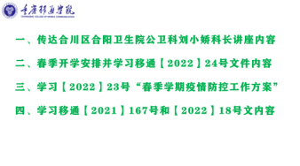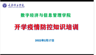 为深入贯彻落实市教委、学校2022年春季开学各项工作部署工作要求,确保2022年春季开学工作安全平稳有序进行,数字经济与信息管理学院于2022年2月17日下午4:00召开了关于“开学疫情防控知识”线上培训会,会议由学院院长潘显兵教授主持,学院全体教师参与。首先会议对于合川区合阳卫生院公卫科刘小娇科长讲座培训内容进行传达,认识到目前开学工作的特殊形势以及春季传染病防范注意事项,时刻绷紧学生返校安全和入校疫情防控两根‘弦’,同时对于学校的春季开学工作进行安排,并学习了移通【2022】24号和23号文件“春季学期疫情防控工作方案”。关注师生的返校动态信息,精准掌握师生安全健康情况,落实主体责任,强化责任担当,及时上报汇报,正确妥善应对,保证开学工作安全、平稳和有序。最后潘显兵院长以简洁有力的语言再次对本次培训进行总结强调:高度重视不惧怕,积极配合强防治,应急处置熟规程,积极防治传染病,熟悉消杀毒知。