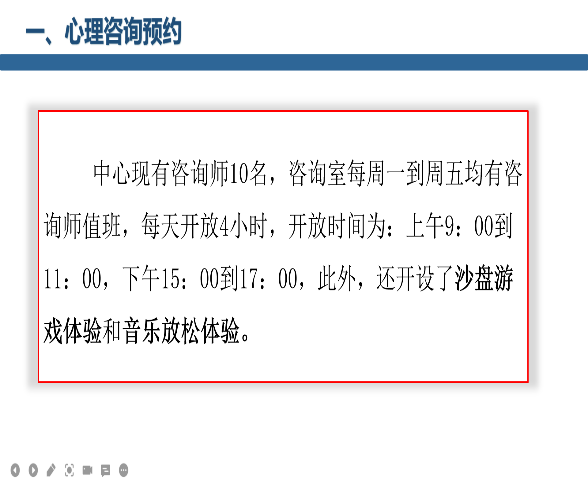 此外,张老师还给同学们介绍了学校的心理咨询中心的地址,特别提到了心理咨询位于文峰食堂的四楼,开放时间为上午9:00到11:00,下午15:00到17:00。