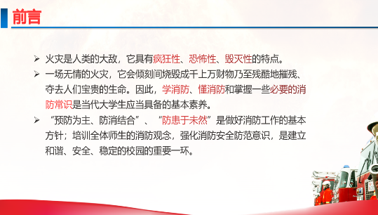 其次,消防安全一直以来都是校方和社会上老身长谈的问题,但是对于此类问题还是有很多人没有规避的了,所以张老师在对安全教育板块进行了消防安全的详细讲解,以及提醒了同学们对消防安全的警示、防火、灭火、逃生四大点详述,让同学们知道何为消防安全,了解火灾常识,在生活如何防止火灾发生,如何在发生火灾时进行自救,最重要的是让同学们平常在生活中也要特别注意用火用电安全。