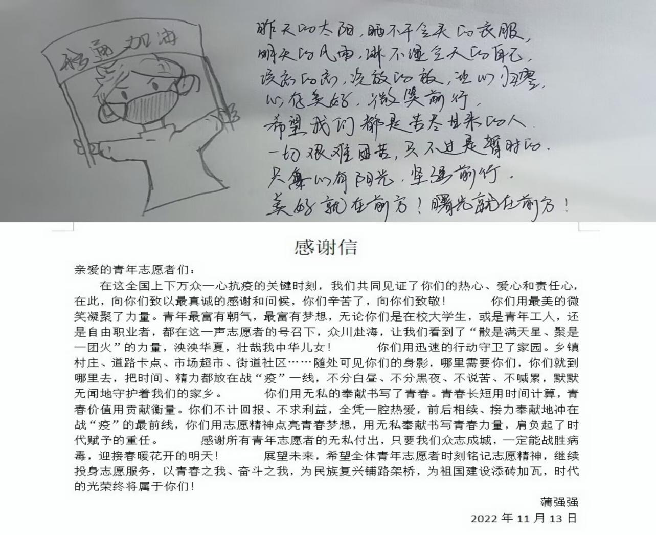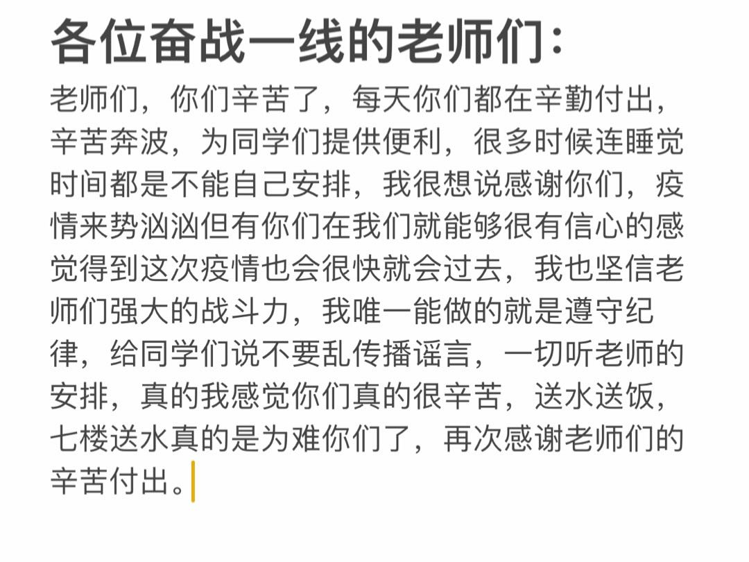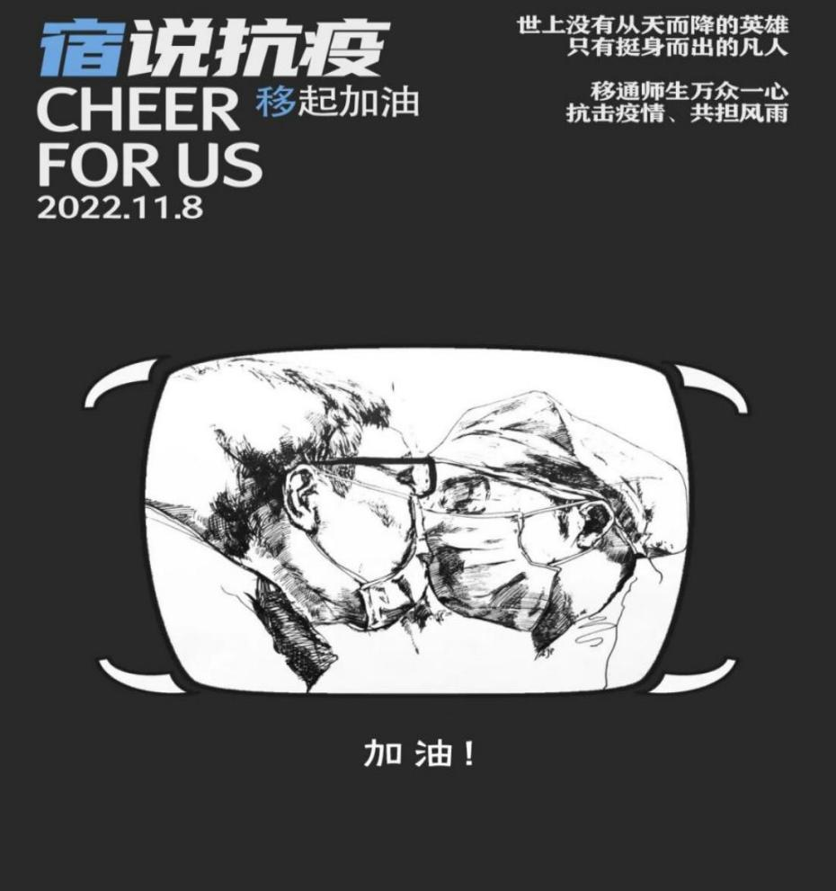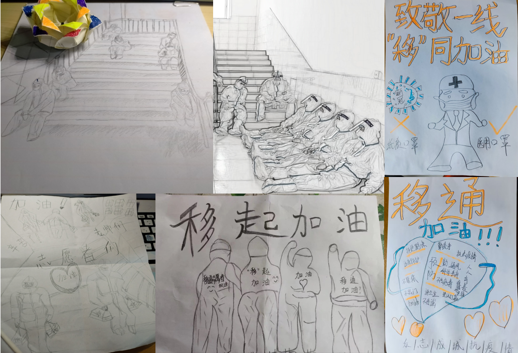 为表达对志愿者的感谢,同时提高同学们的文化素养,我们开展了“疫情里的‘移’道光”子活动,通过书写、绘画、创作等方式记录疫情封控下的温暖画面或防控小知识。一幅幅精心设计的图画、一封封直抒胸臆的感谢信、一张张可爱又充满关心的表情包,陶冶了同学们的情操,丰富封寝生活的同时,为志愿者的心中也带来一丝丝慰藉。