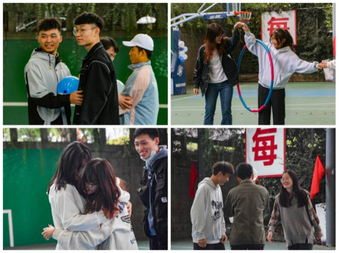 游戏环节分为记忆挑战—了解你我他、鲤跃龙门、爱的抱“爆”以及拔河。九支由三个不同学院的小伙伴组成的队伍将轮流进行PK。活动的趣味性让每一位队员无不尽笑颜开,在游戏鲤跃龙门中,传动的呼啦圈和队员们融为一体,犹如一条长龙一般;在游戏爱的抱“爆”中,每个参与的同学都热血沸腾,响亮的气球爆炸声响彻整个风雨篮球场,整个赛场洋溢着青春与活力的气息。作为团队,大家都在为团队贡献自己的力量,或许这才是此次活动最有意义的瞬间之一吧。