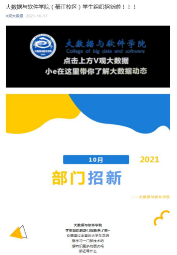 “叮……”2021年10月17日下午,在大数据与软件学院官方微信公众号“V观大数据”里,一则“大数据与软件学院(綦江校区)学生组织招新啦!”的招新通知引起了新生们的高度关注。