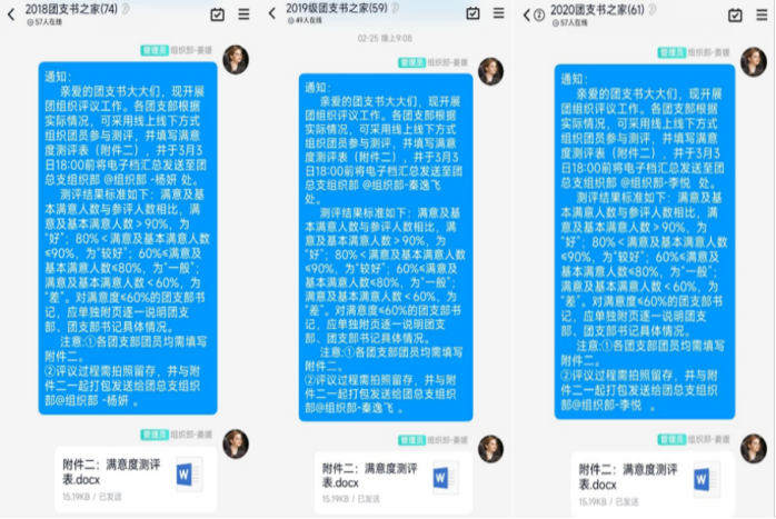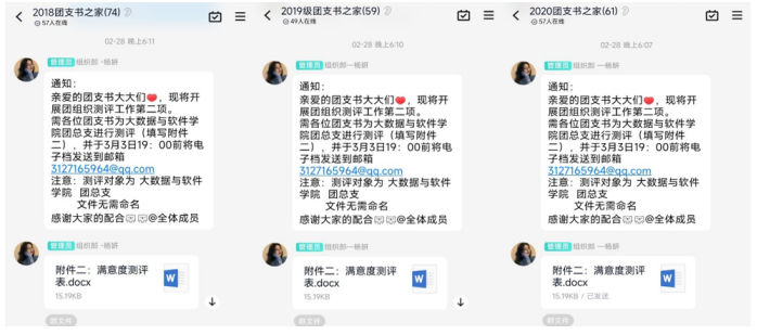 为贯彻落实习近平总书记关于青年工作的重要思想,树立大抓基层的鲜明导向,进一步完善“工作好不好,青年说了算”的评价机制。各级团组织要围绕学习宣传贯彻习近平总书记关于青年工作的重要思想,团十八届中央委员会历次全会和五届团市委历次全会精神,持续纵深推进共青团改革攻坚和团的基层建设、青年大学习等工作。2022年2月25日至3月5日,重庆移通学院大数据与软件学院特于各年级班群、团支书群开展2021年度团支部满意度测评工作,各团支部测评工作在团总支的指导监督下顺利开展。