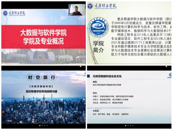 会议伊始,闫会峰院长代表学院对所有参会人员的莅临表示热烈的欢迎,感谢元时空智能科技(重庆)有限公司能给予移通学子如此宝贵的机会,让移通学子不仅能够丰富自己的专业知识,也能获得更多的实践经验。随后,闫院长对学院及专业概况进行了介绍,强调在“四位一体双院制”人才培养模式下,我院学子不仅专业知识扎实,而且综合素质较强。接着,元时空智能科技(重庆)有限公司高桥总经理从公司概述、企业文化、发展规划以及招聘岗位需求等方面进行了介绍。