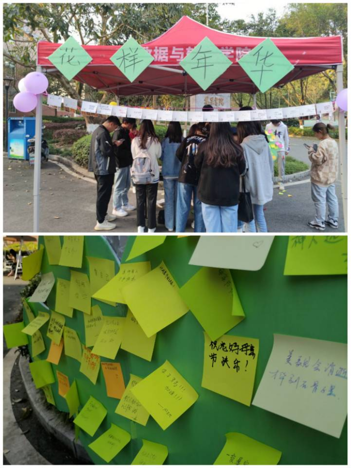 3月8日,是属于每位女孩的特殊节日,女性,在花样的年华里散发自身独特的魅力,体现对女孩的关爱,表达自身所想。因此,大数据与软件学院生活权益女生部于2022年3月8日下午在花果书院宿舍楼下顺利开展了“花样年华,炫丽飞扬”之女生节系列活动,在贺卡或者便利贴上写下对自己、对朋友以及母亲长辈的美好祝语,同时用歌词表达出内心真实感情。