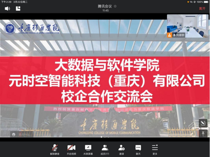 为进一步落实学校信息产业商学院总体办学定位,深化产教融合,融通校企共育人才链条,助力高素质应用型人才培养,2022年3月22日下午14:30,大数据与软件学院与元时空智能科技(重庆)有限公司召开了校企合作线上交流会。与会人员有大数据与软件学院闫会峰副院长、学工办主任童学容老师以及大三大四辅导员老师,元时空智能科技(重庆)有限公司的高桥总经理、业务负责人谭克斌、招聘负责人邓中达、校招负责人温茜、人才发展与校企联合培养负责人孙胜杰,仙桃数据谷招商部主管刘欣、资产运营部副部长张力丹。本次会议由向碧群副院长主持。
