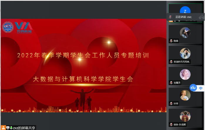 为遵循和贯彻党的教育方针,提高学生会工作人员服务意识与工作能力,提升学生干部的理论素养、研究能力和实践水平,大数据与计算机科学学院学生会于2022年4月5日下午14:00在腾讯会议开展“2022年春季学期学生会工作人员专题培训”。参会人员有大数据与计算机科学学院学生会主席团成员以及学生会全体学生干部,旨在进一步规范学生干部的行为,加强学生会组织建设。