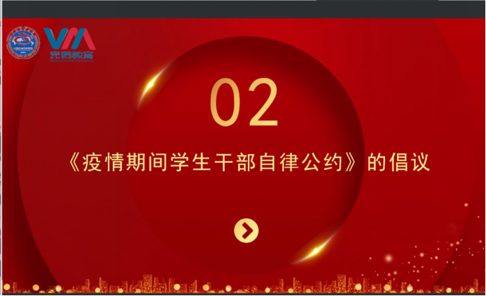 培训第二部分为《疫情期间学生干部自律公约》的倡议书阅读。目前疫情严重,学生会明确要求学生干部应带头落实疫情防护,尽力配合学校疫情防控总体部署,坚持佩戴口罩,不聚集、不私自出校,认真倾听广大同学诉求,积极畅通校园沟通协调渠道,力所能及地帮助同学解决各方面的问题。