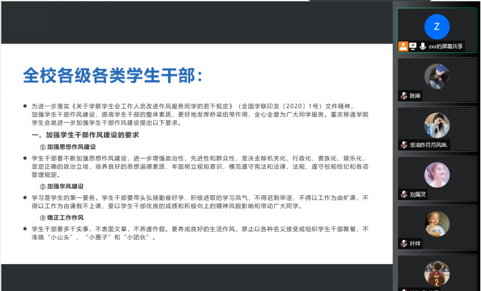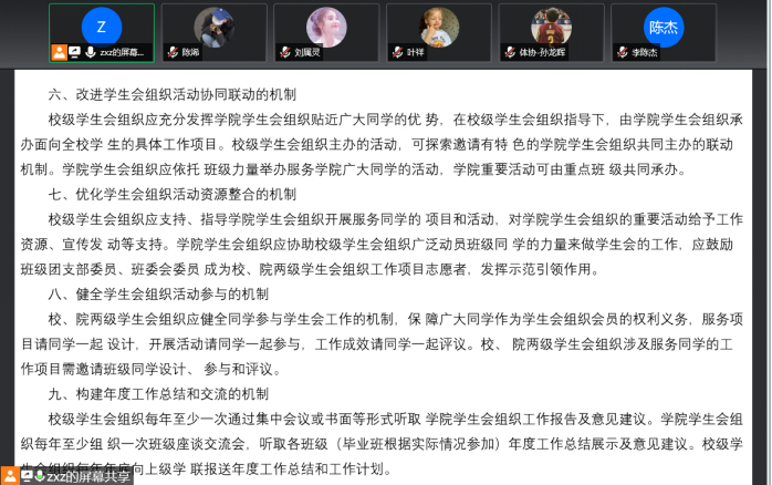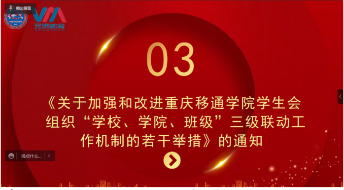 最后,为落实《加强和改进新时代学联学生会工作实施方案》,持续深化学生会改革创新,张星舟同学对《关于加强和改进重庆移通学院学生会组织“学校、学院、班级”三级联动工作机制的若干举措》的通知进行讲解。该通知包含加强学生会组织重大事项请示报告机制建设;建立学生会组织与基层组织的常态化联系机制;完善学生会组织人员从基层选拔的机制;落实学生会组织逐级开展培训等机制,进一步加强组织的凝聚力与创造力,更好地服务同学。