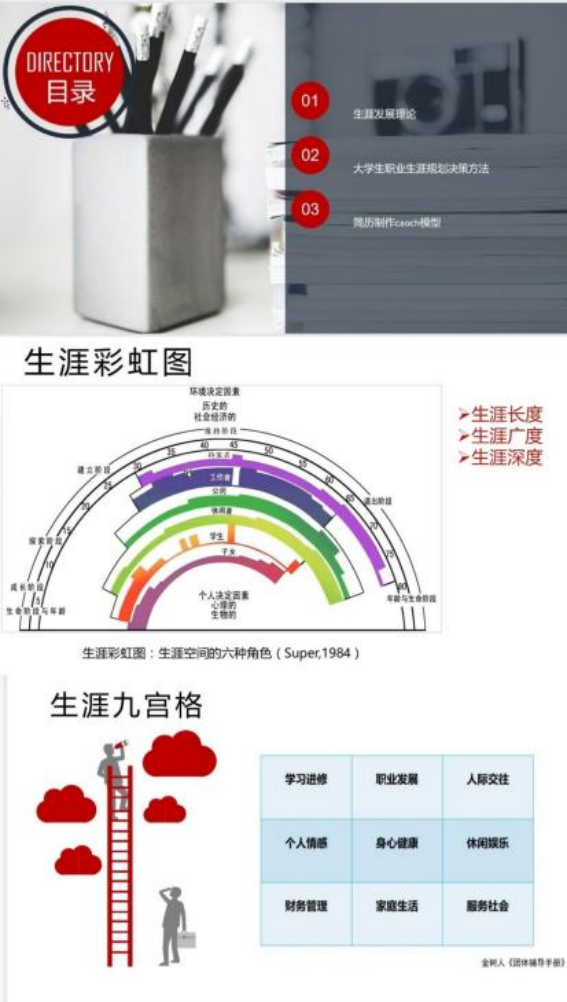 简历如同个人名片一样,一份优秀的简历往往是取得成功的关键。活动伊始,兰宇老师以“如何写出自己满意的简历”为切入点,从三个方面来进行本次活动的分享:首先就是分析整个生涯的一个发展理论;其次就是分享大学生进行职业生涯规划决策的方法,最后是如何制作一份优秀的简历。兰宇老师从大家熟知的生涯彩虹图和生涯九宫格进行分析,从成长阶段、探索阶段、建立阶段、维持阶段到最后的退出阶段是一步一步的完成的,就恰似人出生到结束的过程。