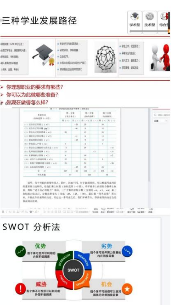 当代大学生会因为不知如何寻找工作而感到迷茫阶段;会因为自己专业知识的薄弱而不知寻找怎样的工作而担忧;也会因为自己不知适合怎样的工作而忧虑。兰宇老师以课堂互动的形式与学生们进行交流,以问题的形式进行更深入的探讨。让同学们了解到参与社会分工,利用专门的知识和技能,为社会创造物质财富和精神财富获取合理报酬,作为物质生活来源,并满足精神需求的这样一个工作,才叫职业。兰宇老师用案例分析展开对学术型,技术型和综合型的探讨,通过三种不同的学业发展路径去思考自己的工作倾向。这恰好可以运用简单的生涯测量工具来进行测量以及SWOT分析法来进行分析。