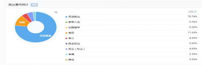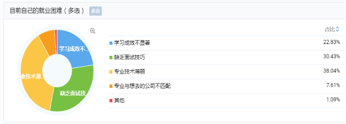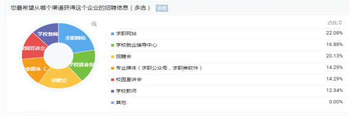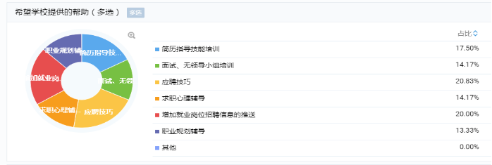 为了更有针对性的开展就业指导工作,辅导员童学容老师在年级会之前开展了就业意向摸底调研,重点针对同学们的就业意向、就业需求、就业困难、就业渠道等多个方面展开调研。从本次调研的200多个数据中,不难看出同学们未来想从事互联网行业的居多,占比74.42%;大家获取招聘信息的渠道主要来自学校发布的招聘信息,占比63.63%;就业意向中选择企业就业,占比76.74%,考公占比4.65%,考研占比11.63%。调研数据显示,同学们对简历指导、应聘技巧、就业岗位信息推送等方面需求较大。本次调研数据,为后续开展毕业班指导工作提供了极为重要的参考。