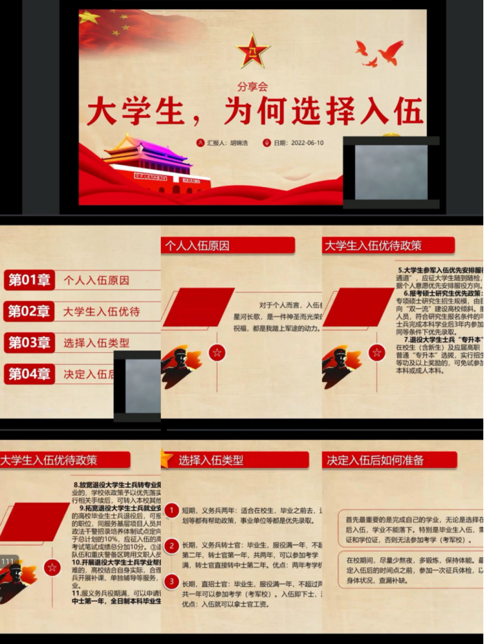 然后是胡锦浩同学为大家带来大学生入伍的经验分享。大学生入伍可以为军队注入更多新鲜血液,同时,也能锤炼同学们的意志,使大家成为更好的自己。胡锦浩同学从个人自身经历出发讲解自己为什么会选择入伍,详细讲解大学生入伍优待政策以及决定入伍之后应该怎样进行准备。