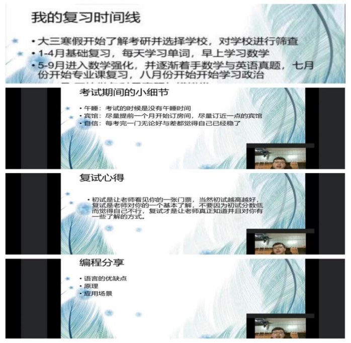 首先是成功考取西南大学研究生的黎昶同学进行分享。在疫情形势反复不定,经济下行压力增大的背景下,众多高校毕业生选择继续考研深造。2022年全国硕士研究生报名人数达457万,但录取人数仅为110.7万,因此正确的学习方法以及完备的信息对于同学们考研来说至关重要。黎昶同学从他的考研初试复习时间线、复试心得、考试期间的小技巧以及编程技巧等方面给低年级同学们进行了非常详尽的分享。