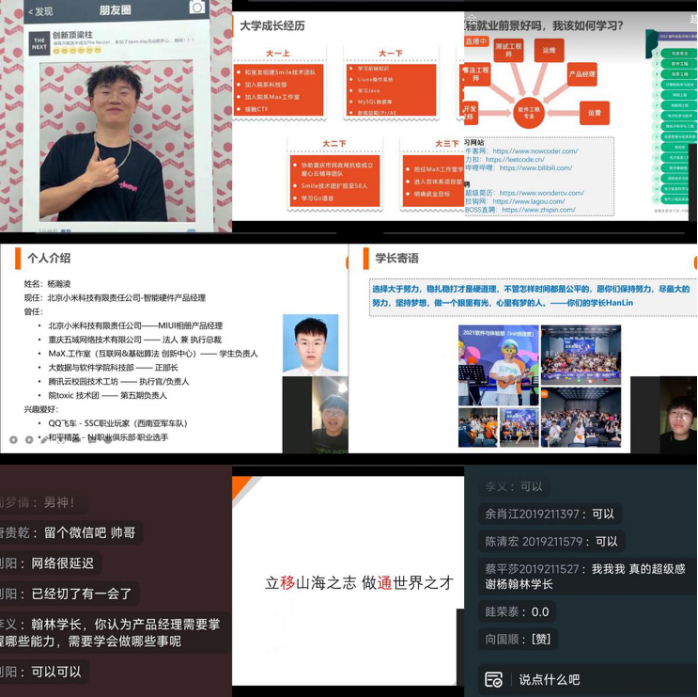最后一位分享的是杨瀚凌同学。杨瀚凌同学现就职于北京小米科技有限责任公司,是一名产品经理。杨瀚凌为大家详细讲述了自己的大学成长经历,希望能够给身处迷茫阶段的同学们一些启发,同时为大家解答了目前困扰大家的一些问题,最后寄语学习学妹们“立移山海之志,做通世界之材”。