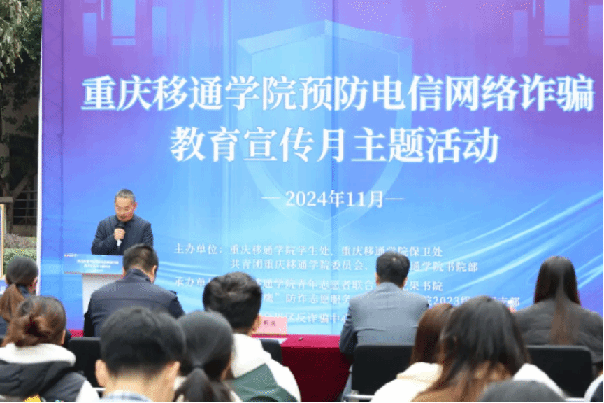 为加强师生对电信网络诈骗手段的认知与辨别,遏制诈骗事件发生,营造全校反诈氛围,实现全民反诈。2024年11月13日,由远景学院、花果书院共同承办的第三届反诈骗教育宣传月主题活动顺利开展。出席本场活动教师及志愿者代表100余名, 现场参与3000余师生。校园安全是高校永恒的话题,学校保卫处作为校园安全的守护者,发挥着举足轻重的作用。随着本次高校反诈骗宣传月主题活动的圆满结束,我们见证了同学们校园防范电信网络诈骗意识的显著增强。通过一系列精心策划的宣传教育活动,不仅提升了广大师生的识骗、防骗能力,还激发了他们参与反诈骗宣传的热情。未来,我们将不断创新宣传形式,确保每位学生都能掌握必要的防骗知识。携手共建一个更加安全、和谐的校园环境!