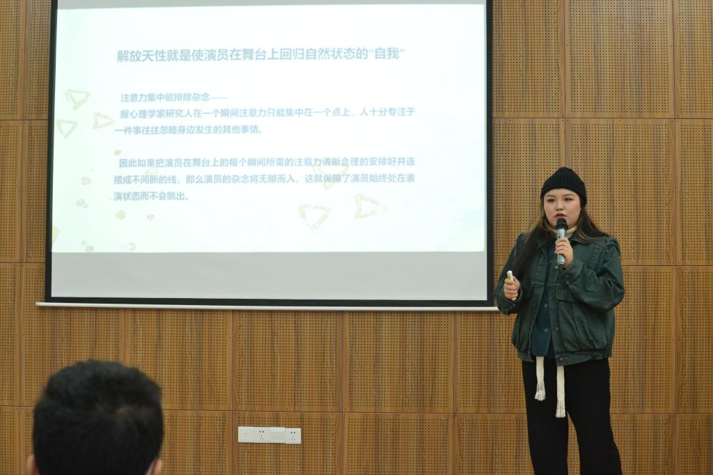 最后便是角色塑造。按照剧本的人物设定分配角色,按照角色分析人物性格,编写人物小传,透彻了解角色在特定环境中的性格,全面地掌握不同时代、不同性格、不同年龄、不同职业、不同风格的角色,认真创作个性,最后便可以完成一个达到演出预期效果的舞台。舞台交流是有机行动中最重要的元素,在现实生活中互相交流是自然而然的下意识中进行的,但舞台上的一切都是事先设计的。林夫学长强调,表演中最忌讳的错误就是演员在舞台上机械的背词,走位。所以演员必须真听、真看、真想,和对手进行真实的有机交谈,而即兴表演是最好的锻炼方式。
