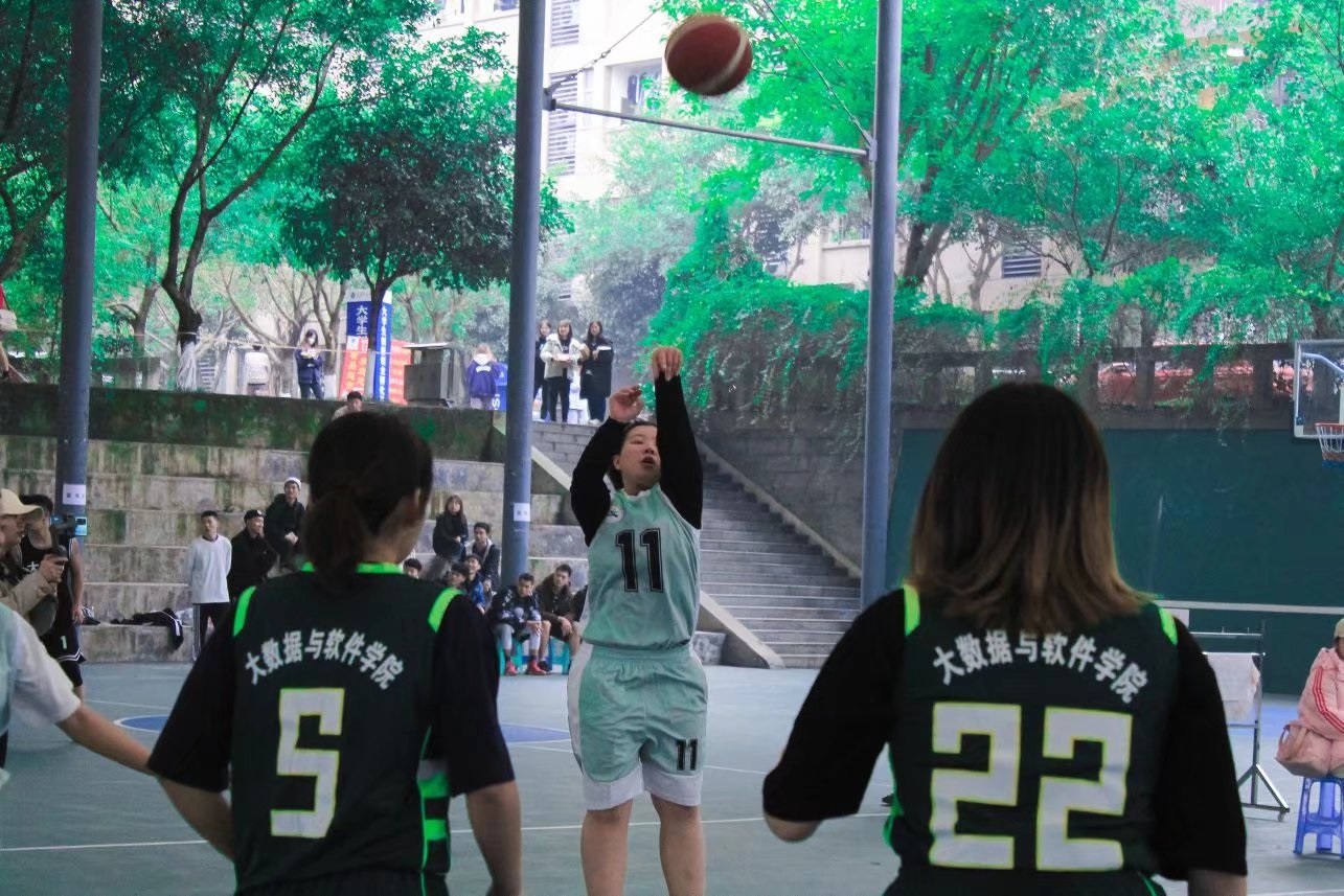 比赛正在激烈地进行着,艺传女篮们身着浅绿色球衣,扎着利落的马尾,深显朝气与活力。开场比赛节奏很快,艺传女篮十分默契,占据上风。大数据女篮也不甘示弱,全力打好配合。只见艺传女篮11号控球来到三分线外,奋力一跃,球在空中划出一道完美的弧线,一记三分球!阵阵掌声,欢呼呐喊,振奋人心!