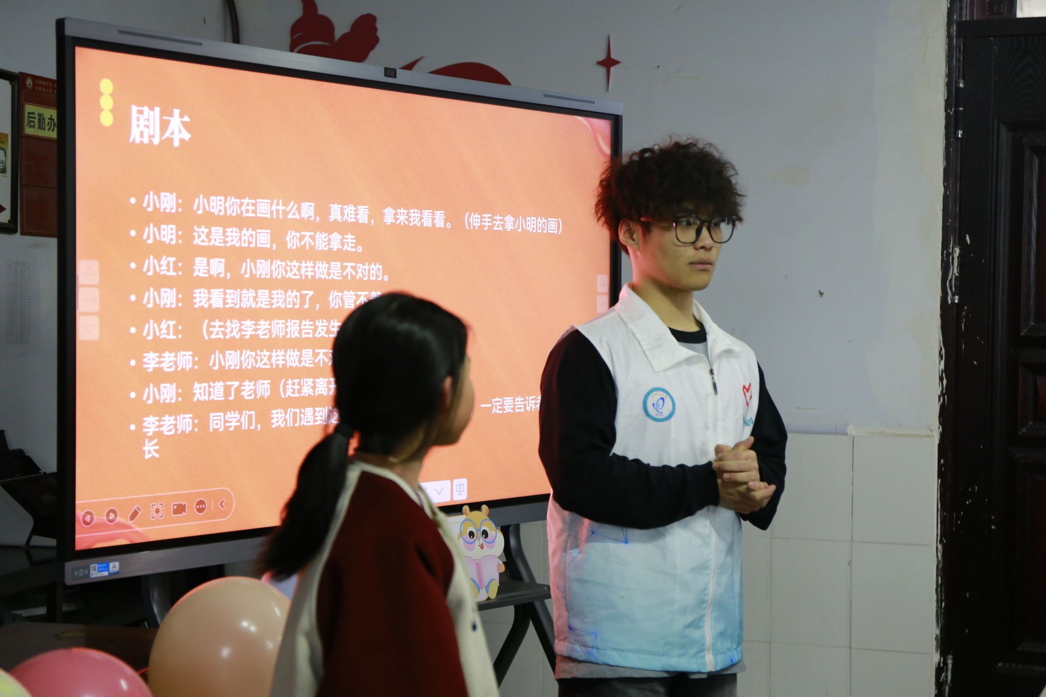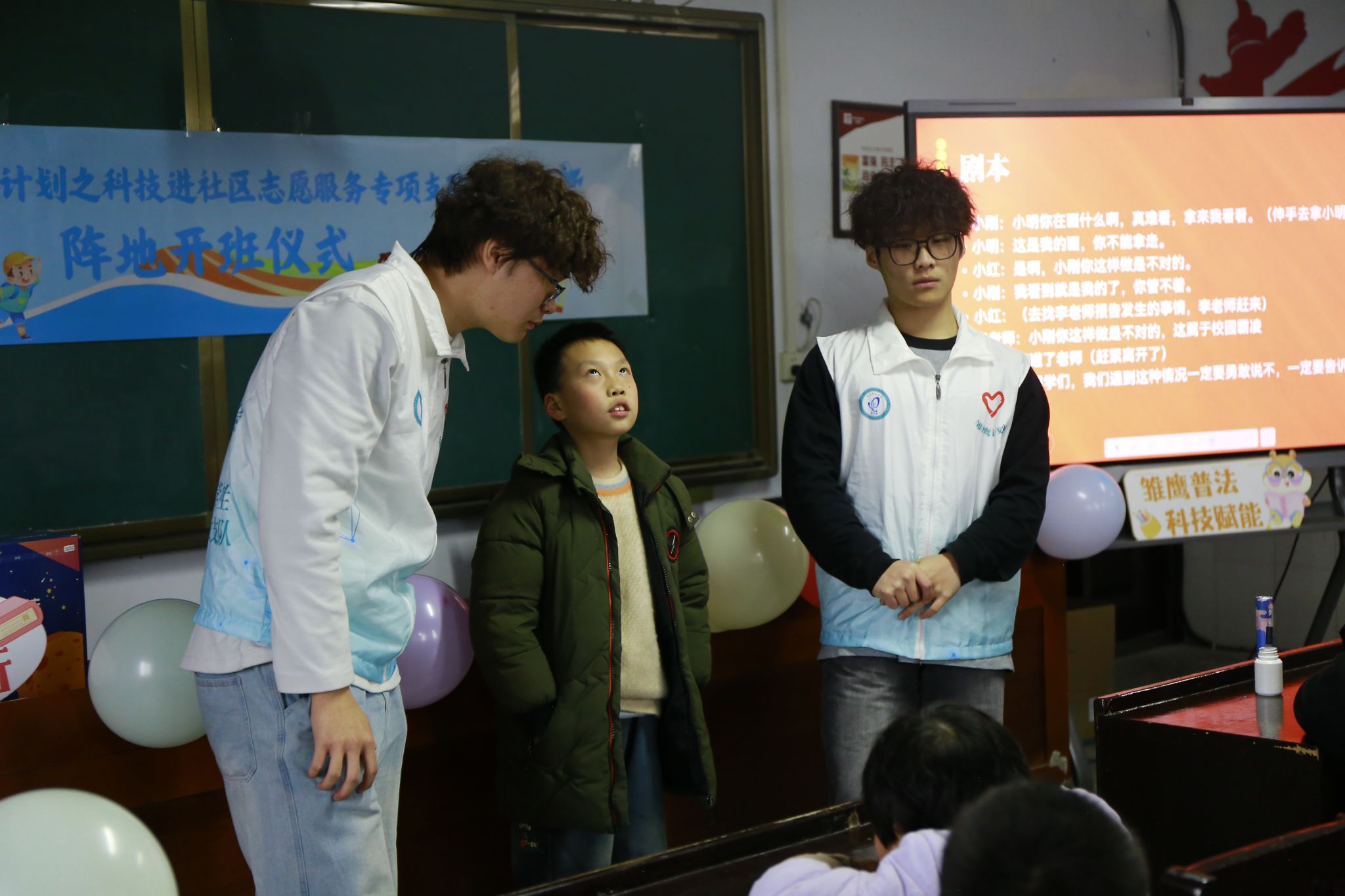 活动的另一大亮点是情景剧演绎环节。志愿者们邀请了几名小朋友参与校园欺凌情景剧的表演。在志愿者的指导下,小朋友们用十分钟时间熟悉剧本,随后上台生动演绎了校园欺凌的场景。通过情景剧的形式,小朋友们直观地感受到了校园欺凌的危害,并学会了如何运用法律武器保护自己和他人。