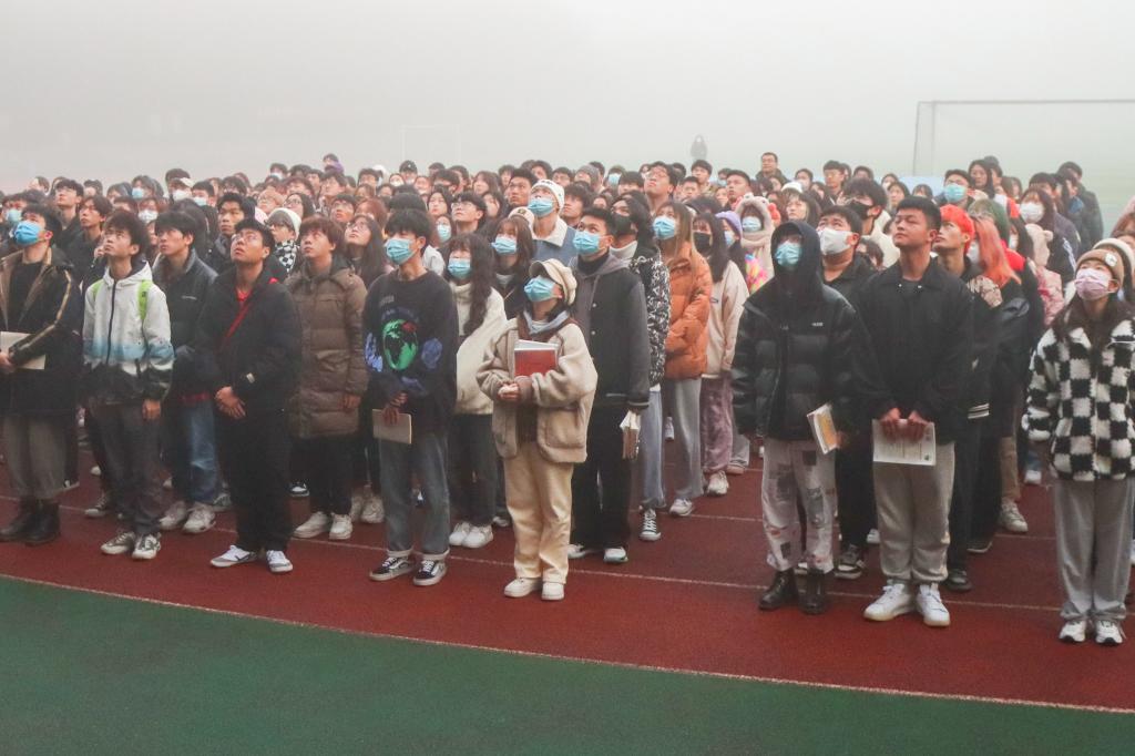 在各年级辅导员的组织下,同学们面向主席台有序排好队列,伴随着《义勇军进行曲》的响起,五星红旗徐徐展开,全体师生庄重地注目着冉冉升起的五星红旗,高唱国歌。