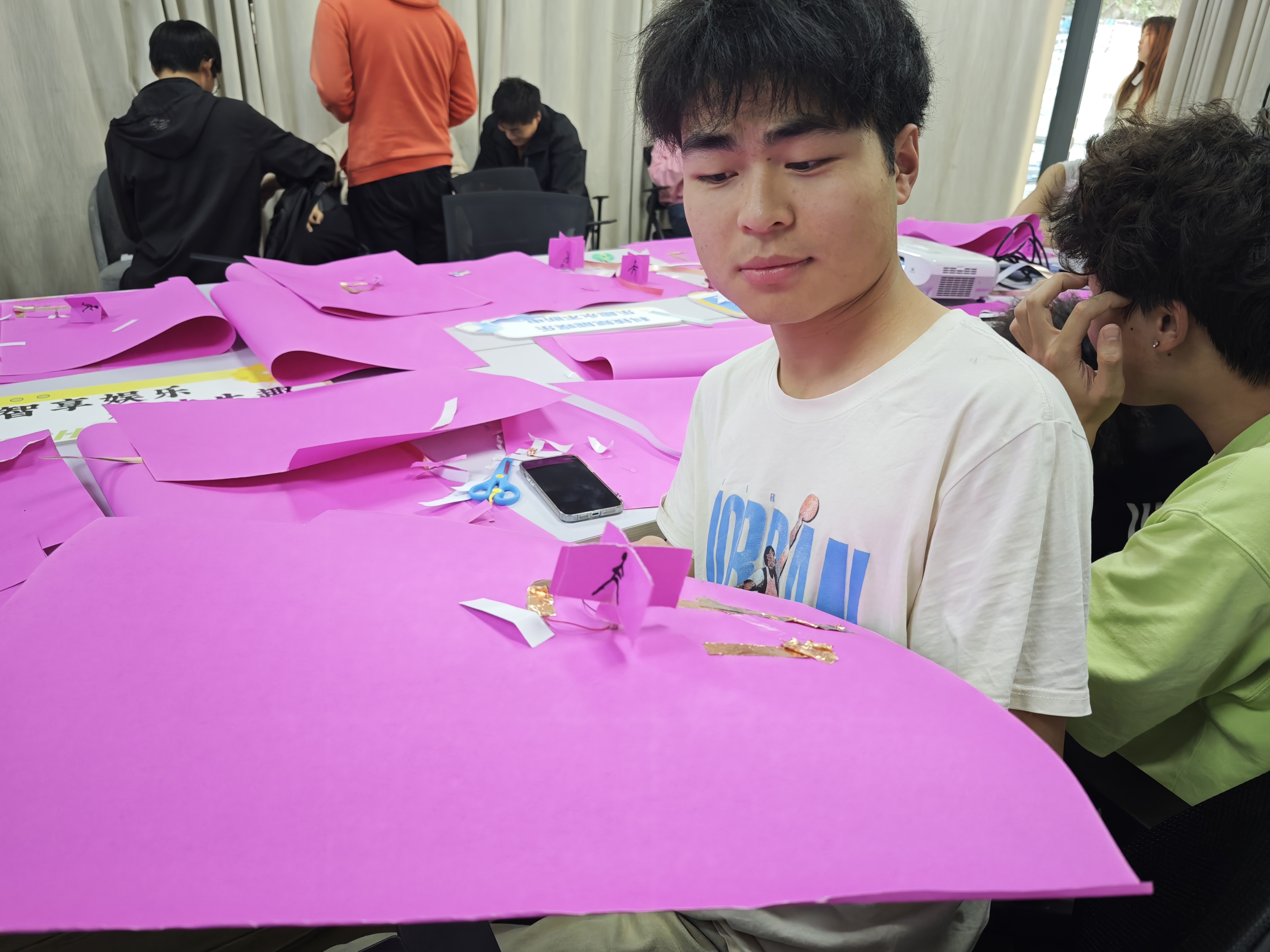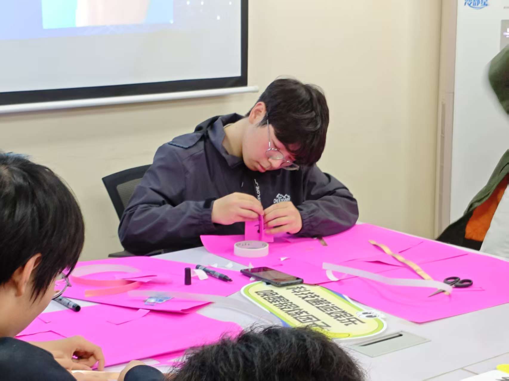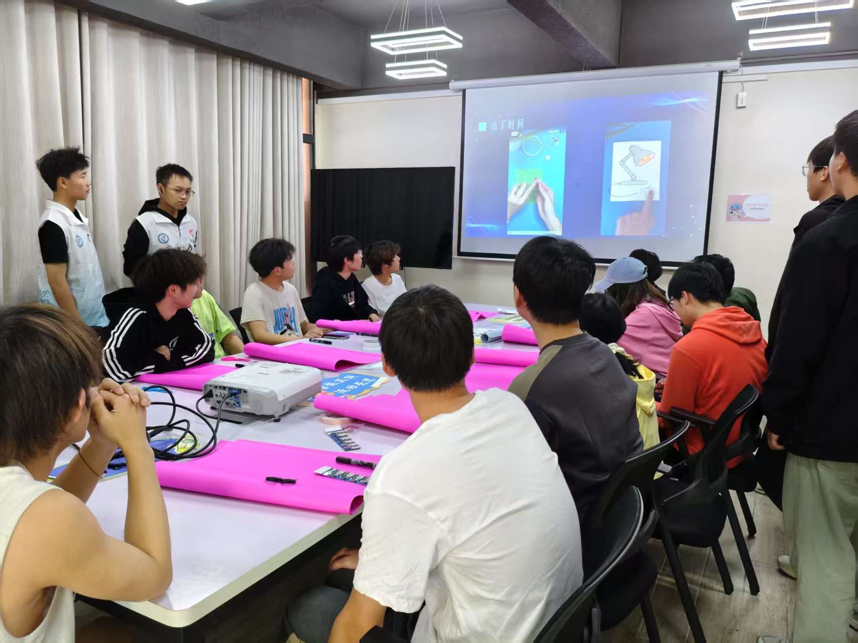 活动现场,主持人通过介绍一些简单易懂的科技原理以及科技制作的常见方法,让同学更好地了解生活中的一些小科技,激发学生们对科技制作的兴趣。除此之外,为了提升团队的协作能力、时间管理技巧以及对复杂任务的处理效率,主持人将带领同学们完成材料组装大比拼,根据PPT中小发明制作教程,同学们进行实际操作,完成一个个有趣的科技小发明。裁判通过小组用时多少与完成质量,进行评分。此次大比拼设一等奖4名,参与奖若干名。评分越高者,奖项越高。