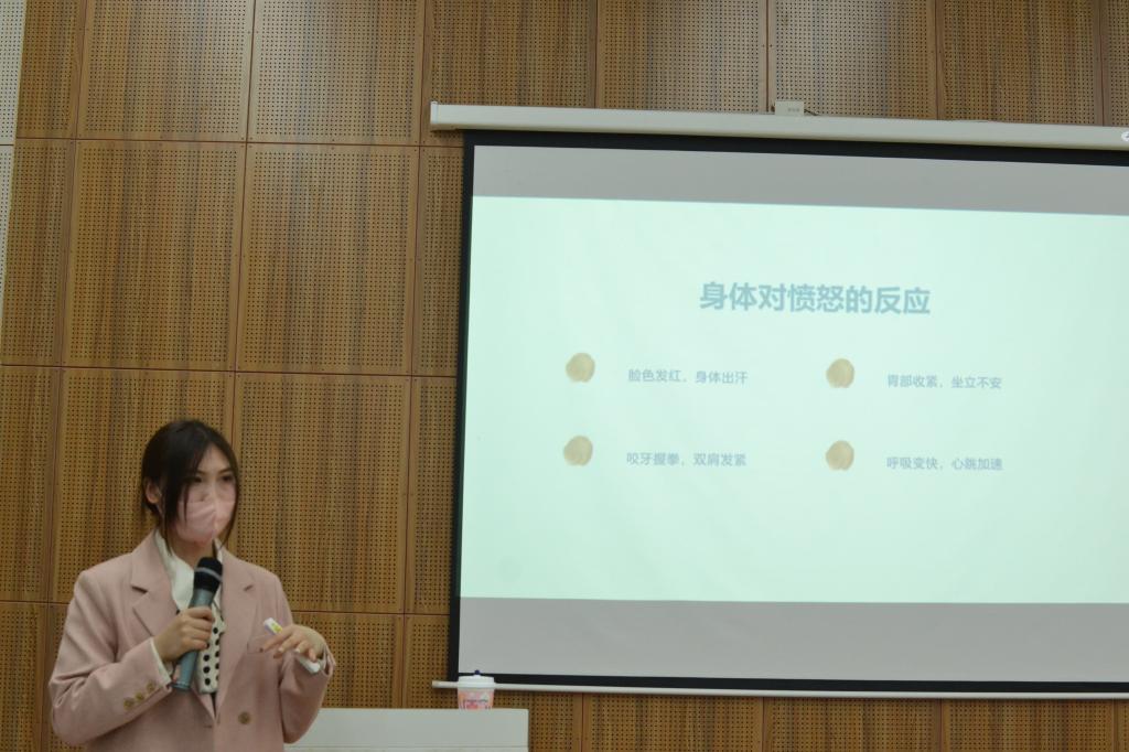 曾玉娇老师为大家带来了一些有关心理健康的小知识,例如情绪的基本类型、情绪对人有什么影响、怎样摆脱不良情绪。老师了解到同学们最近的烦恼和焦虑大多与专业学习考试有关,因此为同学们提出了缓解焦虑的方法,通过身体上的律动和声音上的发泄来减少自我心理上的困境。同时,老师还用视频的形式为大家展示愤怒管理的方法,总之人的情绪众多,影响情绪的因素也各有不同,如何摆脱情绪对自己显得至关重要。。