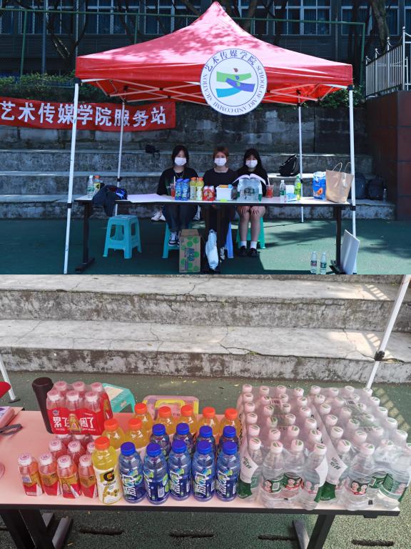 为了给艺术传媒学院运动员们提供最及时的物资,竞技体育协会的干部干事们早早的设置服务点,给运动员提供休息的场所和功能性饮料。为大家准备物资药品,保障大家的后勤,都离不开最美工作人员们的付出